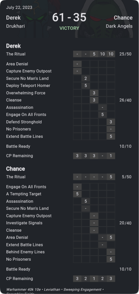 What a close game that was! I even managed to get tabled, however through denying primary and getting lucky on my secondaries I was able to maintain a lead throughout the match. I don’t like the Ritual, however with Multiple Small Unit builds there shouldn’t be any means for the score to always be this low. Rather you could just have your opponent drop the objectives and then you sweep in and take them for your own! We will dive deeper into that thought one day, but I am worn out from all this typing!