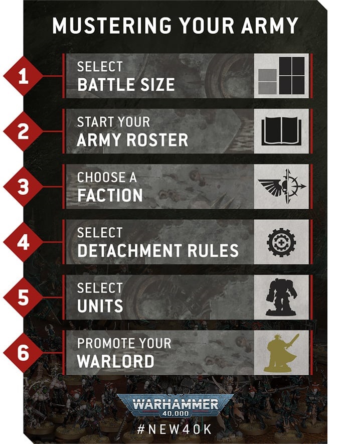 Step 1: Picking a Battle Size, they have given us three different options for games, 1000, 2000, and 3000+ points. If you are playing an odd number like 500 you would just round up to the nearest thousand number and go from there. Nothing much too this, I would highly suggest that you do smaller point games when you first learn, a 500 point round between two newer players could take 1-2 hours. We can reduce the time of playing games by trying to get more repetition in with your army, and memorizing the core rules and key datasheets in your army.