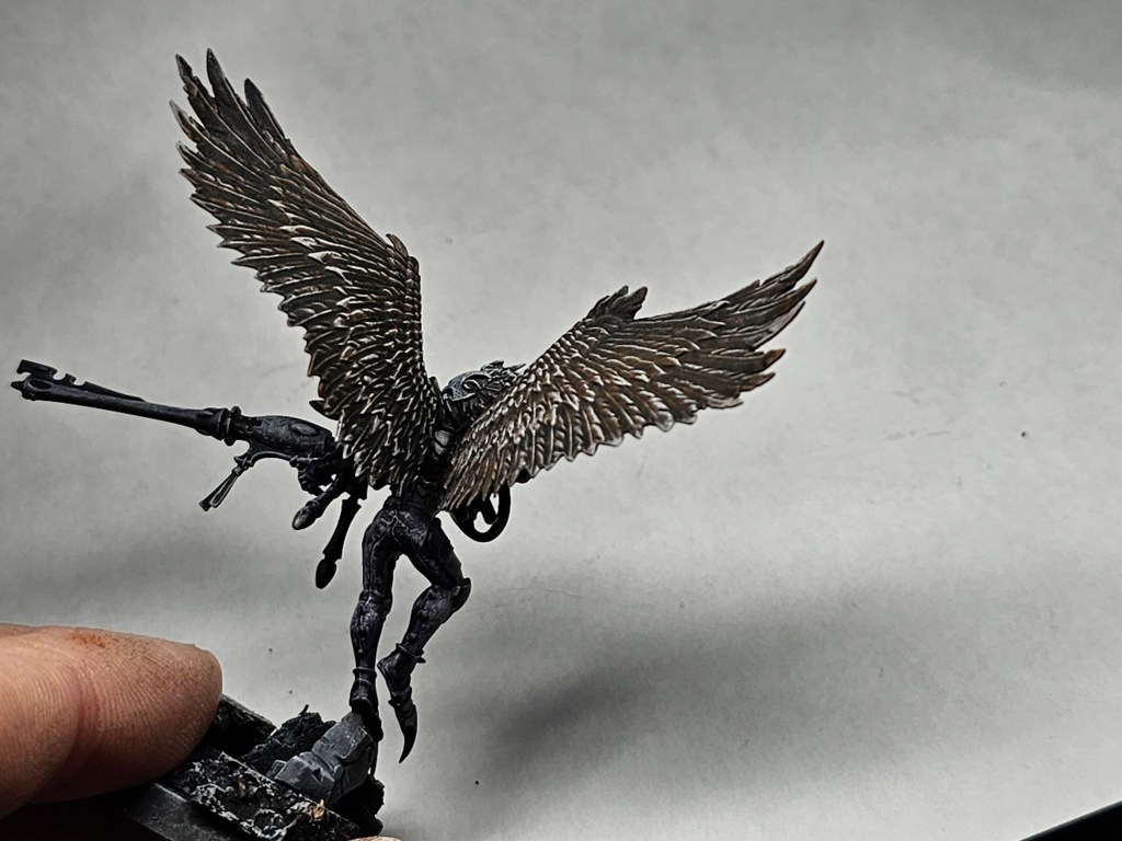 Now that we have our paints selected, we need to put the down on our pallet. Next let’s take a nice flat brush with a good size, put it in our paint. Next we are going to wipe off almost all the paint on either a paper towel, or piece of cardboard. Once most of the moisture is off, you need to paint from top to bottom down all over the model. The paint should catch on the raised surfaces of the model, and leave the crevices alone. We are starting to build a Zenithal highlight now, for those of you whinier airbrushes you will notice the pattern.