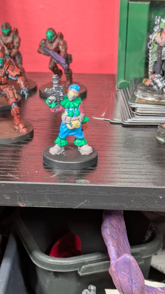 The red guys are getting glammed up for their next training session. Ben Franklin’s Bastards are getting ready to shock the Underworld Scene. Then we come to Finale, this guy was the MVP from my last cyberpunk scenario. So I blocked in the colors.